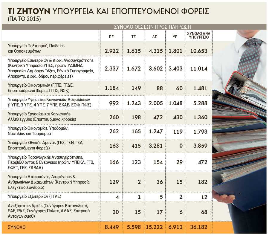 Από τα υπουργεία και τους εποπτευόμενους οργανισμούς που κατέθεσαν αιτήματα για την πρόσληψη προσωπικού στην πρώτη θέση έρχεται το υπουργείο Εσωτερικών με 11.014 αιτήματα, καθώς περιλαμβάνει τους δήμους, τις περιφέρειες και τα πρώην υπουργεία Δημόσιας Τάξης και Διοικητικής Μεταρρύθμισης και ακολουθεί το υπουργείο Πολιτισμού, Παιδείας και Θρησκευμάτων με 10.653 αιτήματα.